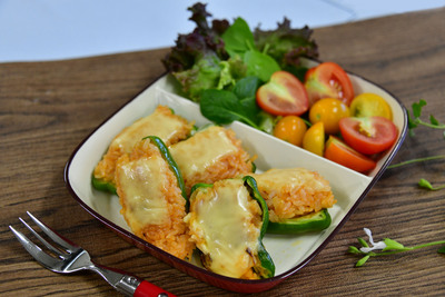 6、5をピーマンに詰め込む。※ある程度握ってから入れるとやりやすい。