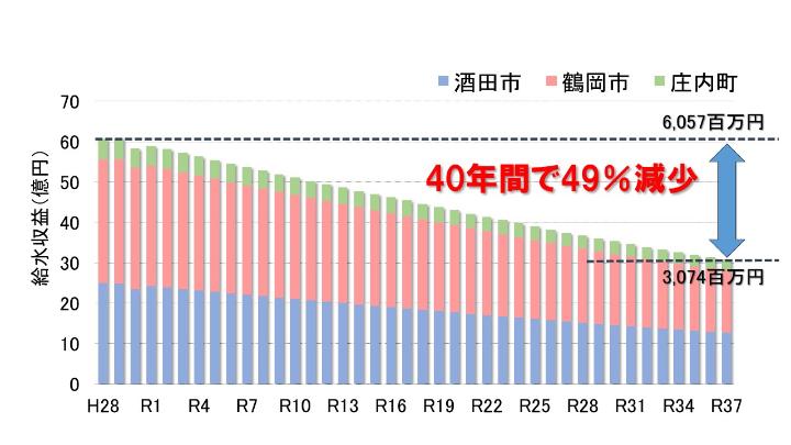 庄内地域(酒田市、鶴岡市、庄内町)の給水収益は、人口減少等の影響から、令和37年度には平成28年度と比較して、半減すると見込まれています。また、給水量の減少に伴う、水道施設の稼働状況の低下が大きな課題となっています。